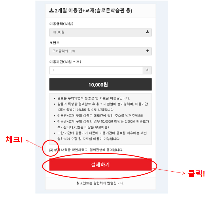 | 6. 아래 그림과 같이 동의 체크를 하고 결제하기 버튼을 클릭합니다. |