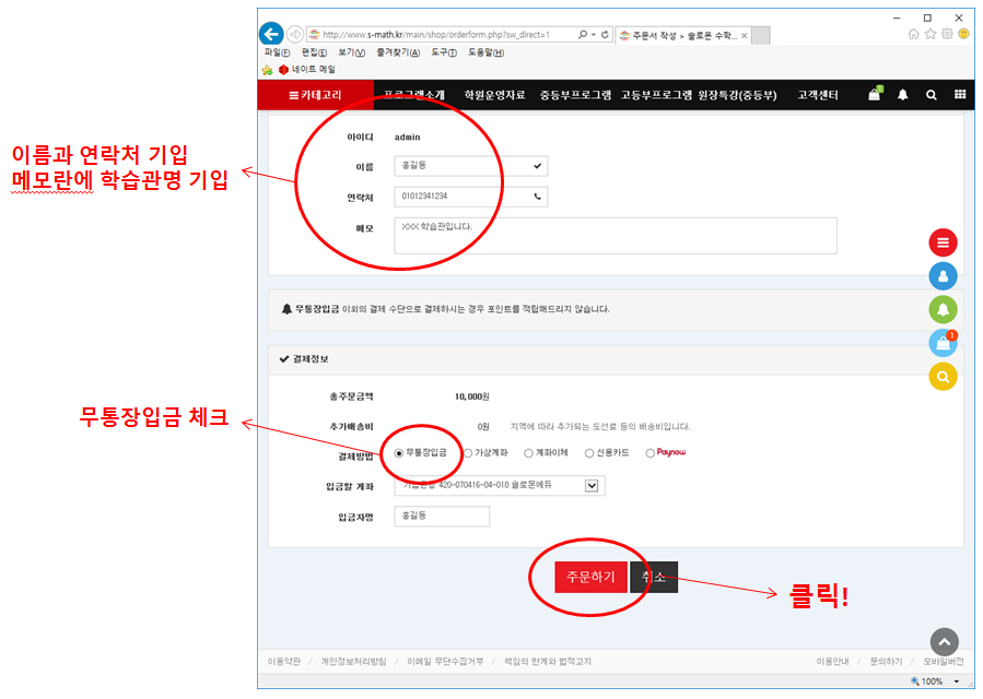 | 7. 아래 그림과 같이 이름과 연락처를 기입하고, 메모란에 학습관명을 기입하시고, 무통장입금 체크하시고, 입금계좌 선택, 입금자명 기입후 주문하기 버튼 클릭을 하시면, 본사에서 확인 후 승인처리 해드립니다. |